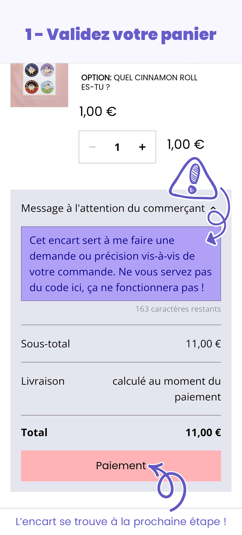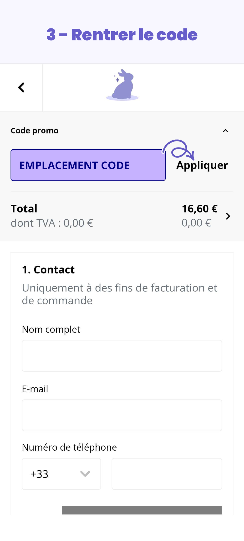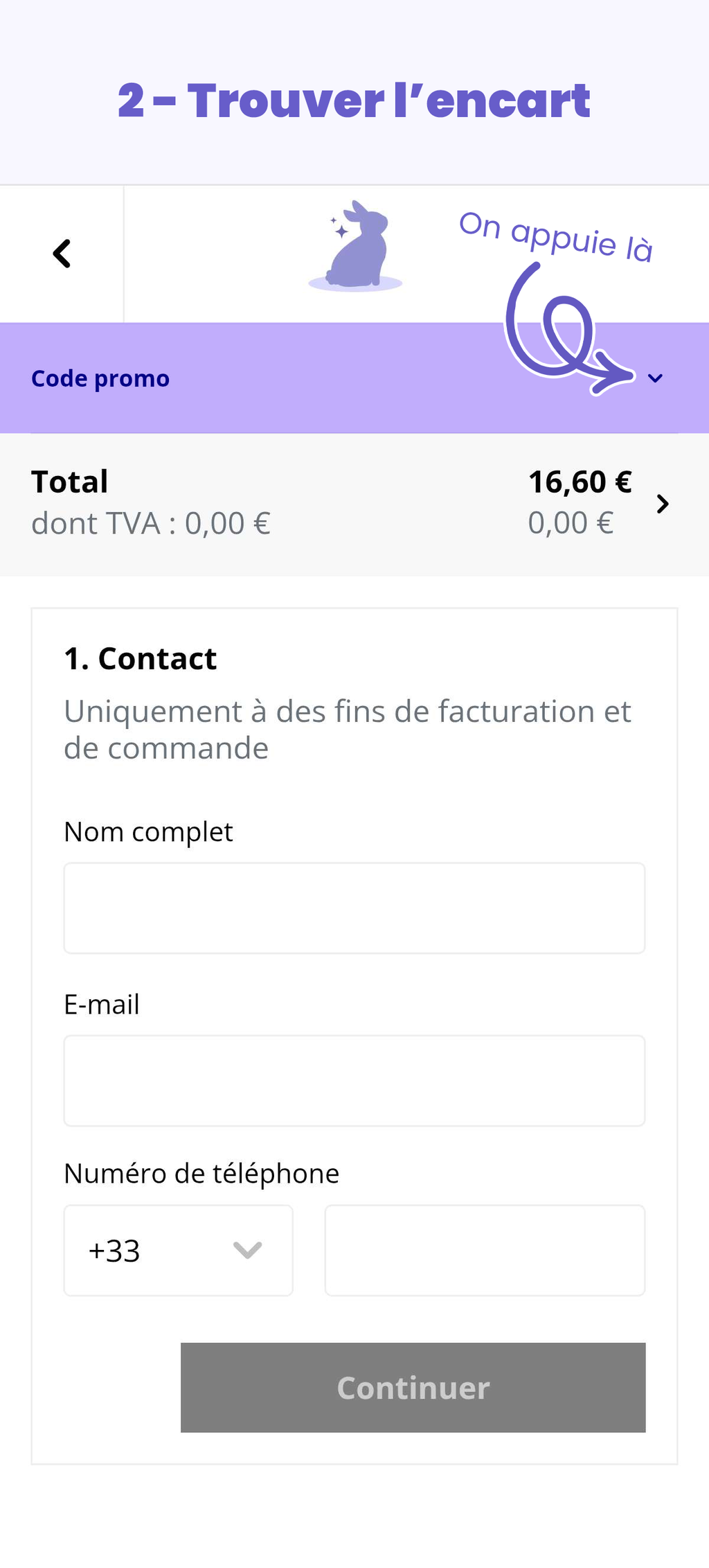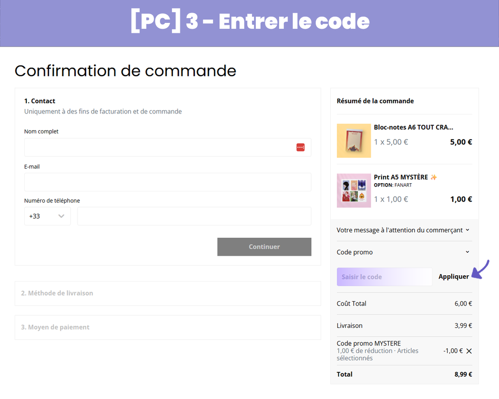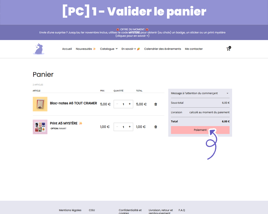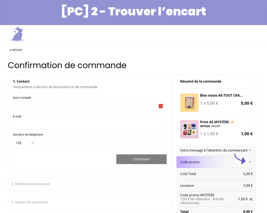 L’encart pour saisir un code promotionnel n’apparaît pas directement sur la page du panier, mais sur celle de la confirmation de commande. Pour y accéder, il faut cliquer sur le bouton « Paiement », puis dérouler la section dédiée (voir le tutoriel en images juste en dessous ! 👇).